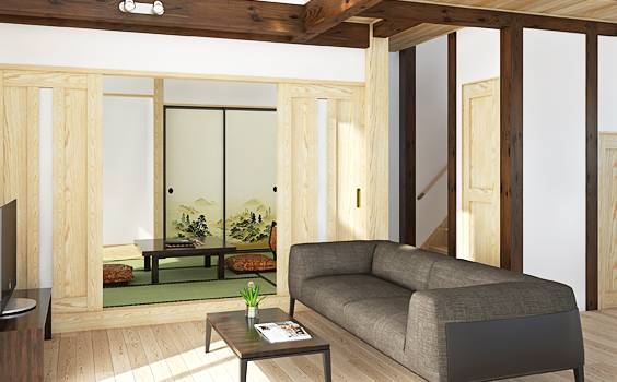趣があり暮らしやすい家 温泉宿見たいな家に住みたいという希望から実現しました。昔卓球選手だったご夫婦が朝から晩まで卓球漬けになっても大丈夫な家にしたのです。木の良さが最大限に活かされた一目ぼれした欄間を飾り、アンティーク家具が映えるような間取りを実現しました。